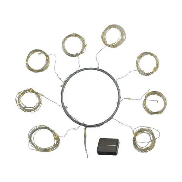 Der er 8 lyskæder på 1,5 meter hver (+ 2 meter til stikkontakt) med 96 eller 128 LED-lys på en kobberledning.