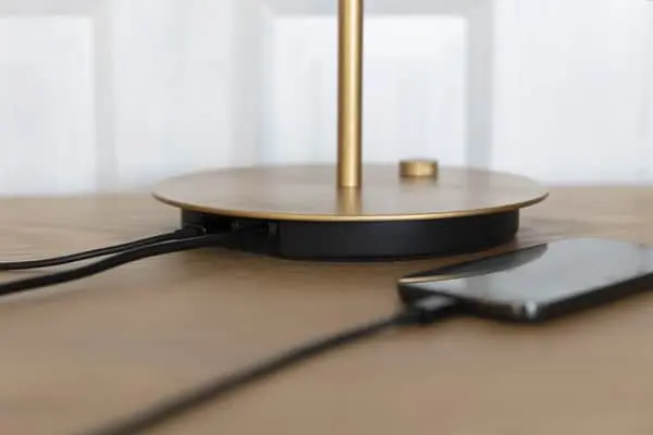Denne elegante Asteria bordlampe har en diameter på 31 cm, og en indbygget LED-panel med en diffusor, der sikrer en blød belysning i rummet. Lampen har en skjult USB-port, så du kan oplade din telefon, selv når lyset er slukket.